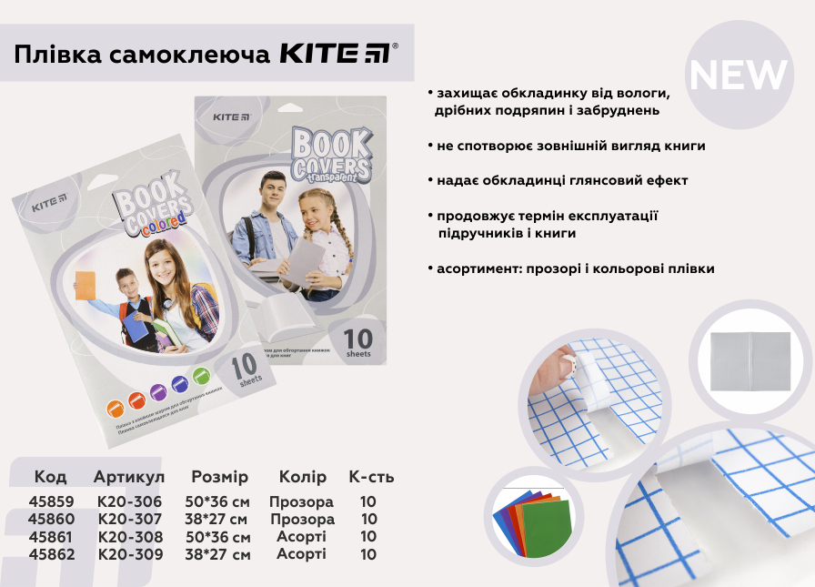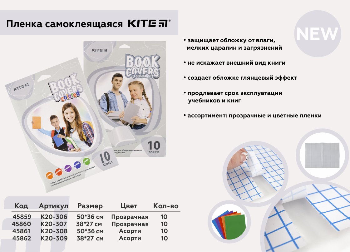 Плівка самоклеюча для книг Kite K20-309 збереже підручники в ідеальному стані. В комплекті – 10 яскравих аркушів: 5 кольорів (помаранчевий, червоний, фіолетовий, синій, зелений), кожного по 2 шт. Книжки виглядатимуть яскраво і стильно. Плівку можна протирати серветкою та дезінфікувати, вона зовсім невибаглива в догляді. Нею можна обгорнути підручник або зошит навіть нестандартної форми. Вбереже від бруду і вологи, продовжуючи термін експлуатації.