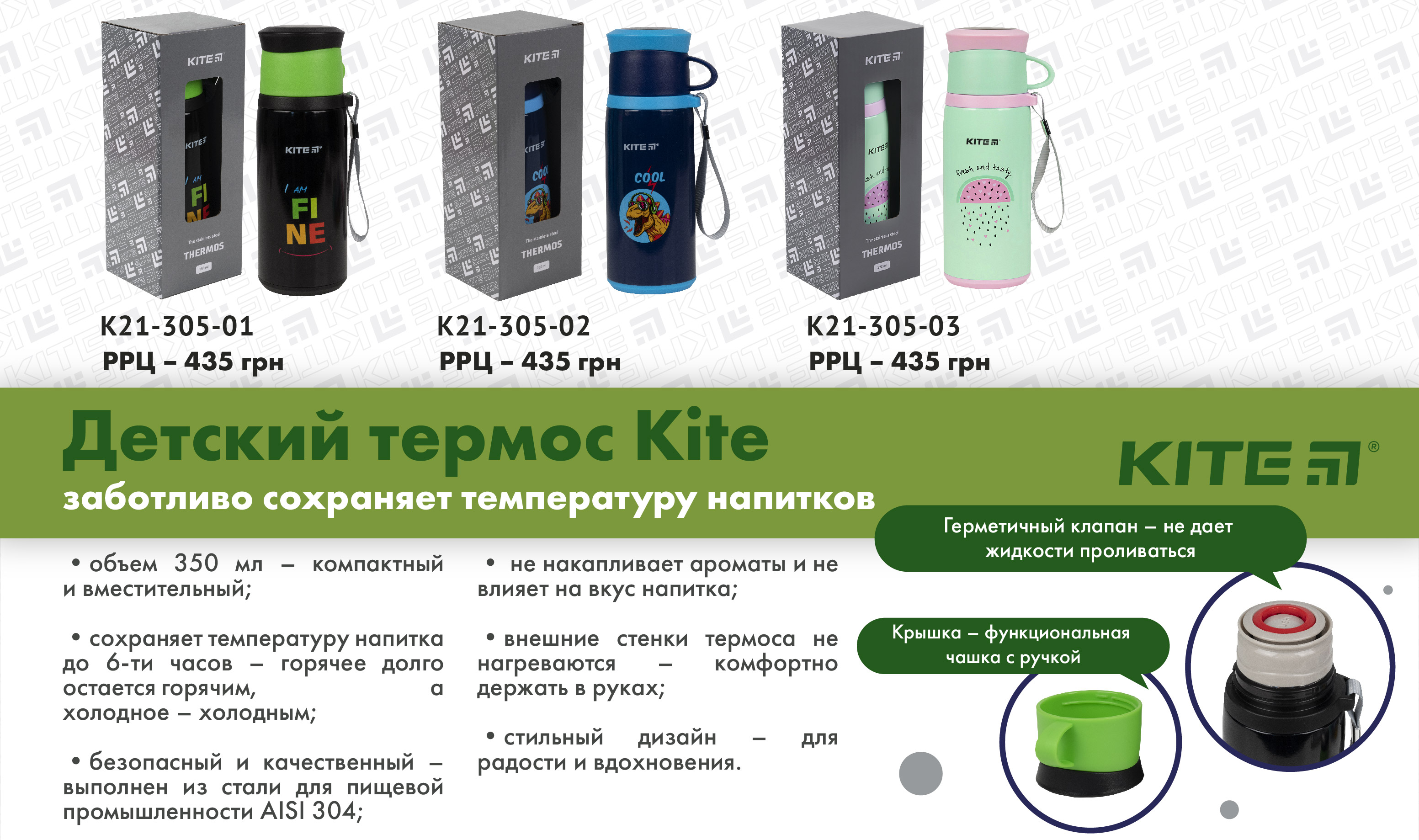 Термос дитячий Kite K21-305-02 дбайливо зберігає температуру напоїв, щоб дитина могла в будь-який момент підкріпитися теплим ароматним чаєм, корисним компотом чи смачненьким какао.