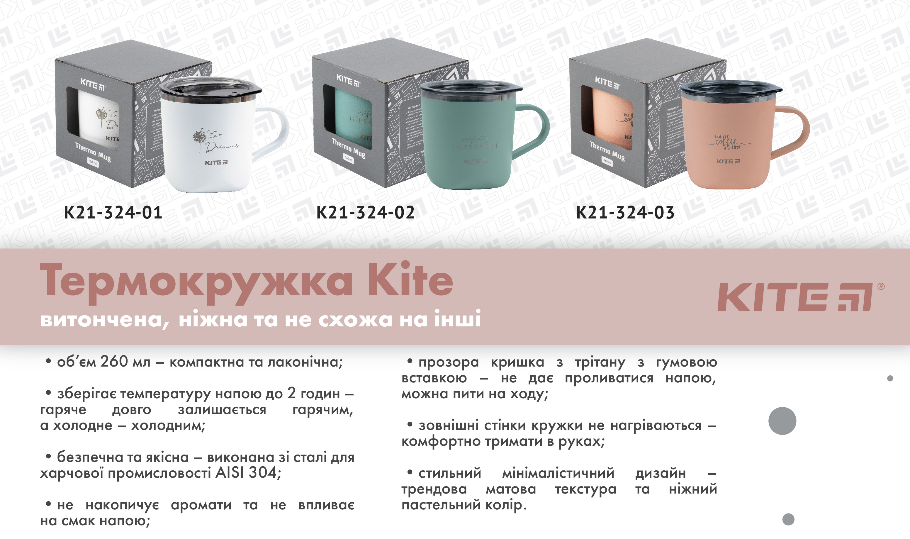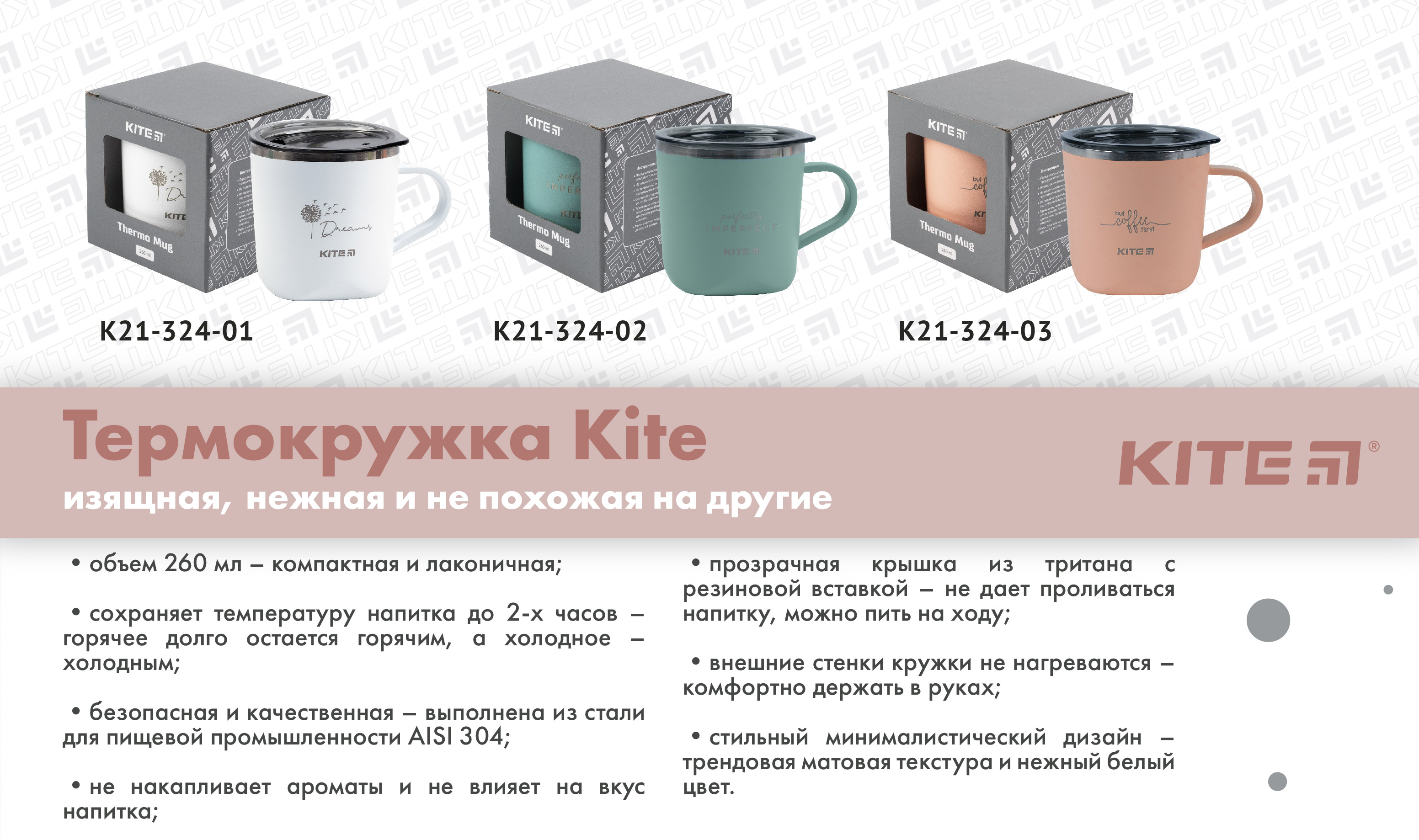 Термокружка Kite K21-324-01 просто неймовірна. Витончена, ніжна та не схожа на інші. Вона поєднує в собі бездоганну функціональність, безкомпромісну якість та приголомшливий дизайн. З цією кружкою ви зможете насолоджуватися смаком улюблених напоїв та отримувати естетичне задоволення від її вишуканого оформлення.